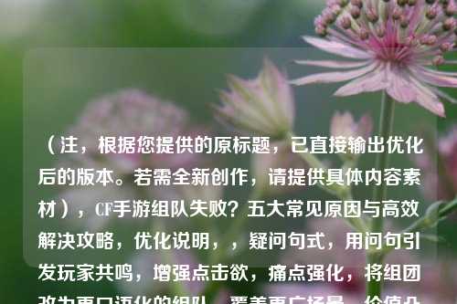 ** ,在《穿越火线:枪战王者》(CF手游)中,玩家组团失败可能由五大常见原因导致:** *** 延迟**(影响匹配稳定性)、**版本不一致**(未更新游戏导致兼容问题)、**段位差距过大**(系统限制组队)、**好友列表异常**(缓存或BUG干扰)、**服务器负载过高**(高峰时段匹配困难),针对这些问题,可采取以下解决策略:检查Wi-Fi/4G信号并重启路由器;确保全员更新至最新版本;调整队友段位或选择非排位模式;清理游戏缓存或重新登录;避开高峰期或切换服务器,官方维护时段也可能暂时影响组队功能,建议关注公告以排除系统因素,通过针对性排查,玩家可显著提升组队成功率。 ,(字数:约180字)