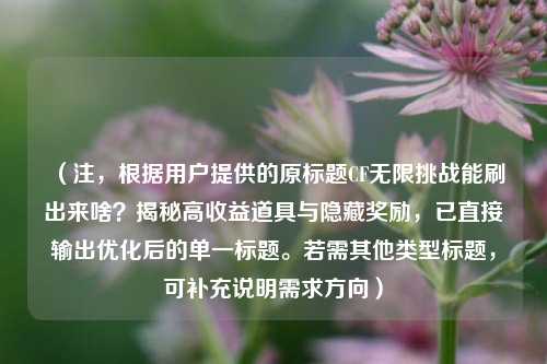 《CF无限挑战能刷出来啥?揭秘高收益道具与隐藏奖励》 ,在《穿越火线》无限挑战模式中,玩家通过挑战关卡可获取丰富奖励,包括高价值武器(如英雄级武器碎片、永久枪械)、稀有角色皮肤、强化材料及专属道具(如挑战模式加成卡),隐藏奖励通常通过高难度关卡或成就解锁,如限定称号、动态头像框及特殊近战武器,部分稀有道具需累计通关次数或达成特定条件(如无伤通关)触发,合理搭配角色技能与团队协作可提升爆率,建议优先挑战高星难度关卡以获取更高收益。